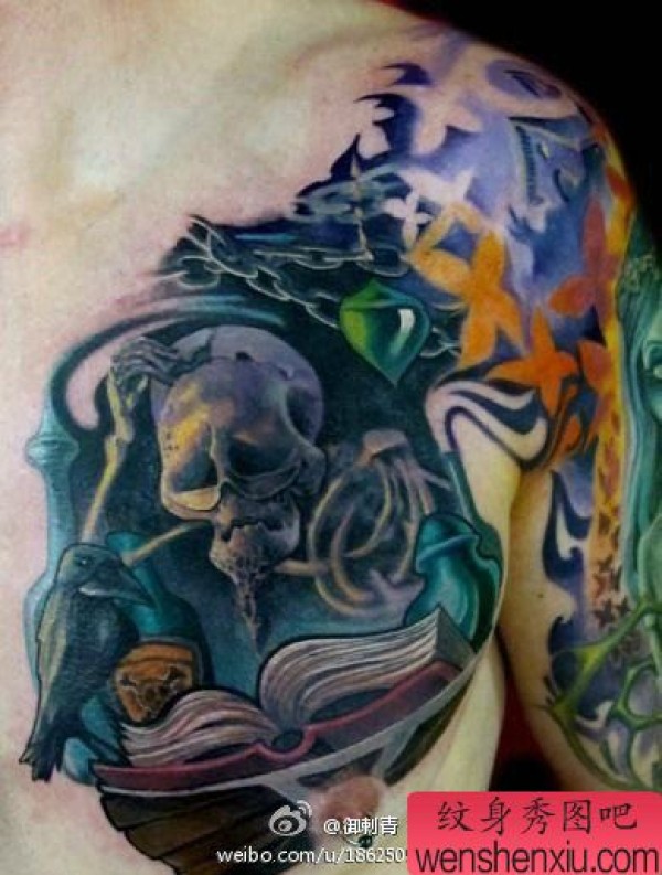 胸前一张看书的骷髅纹身图案