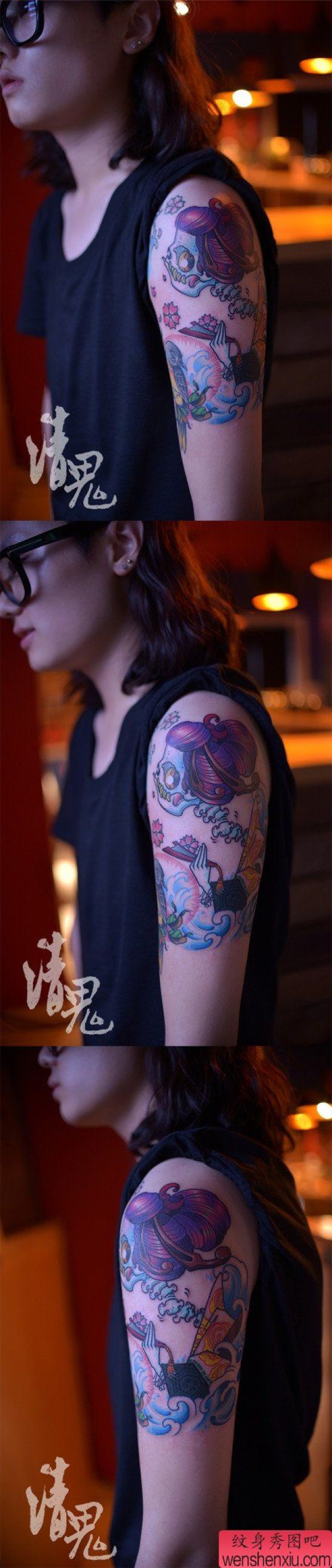 女孩子手臂一张时尚经典的彩色骷髅纹身图案