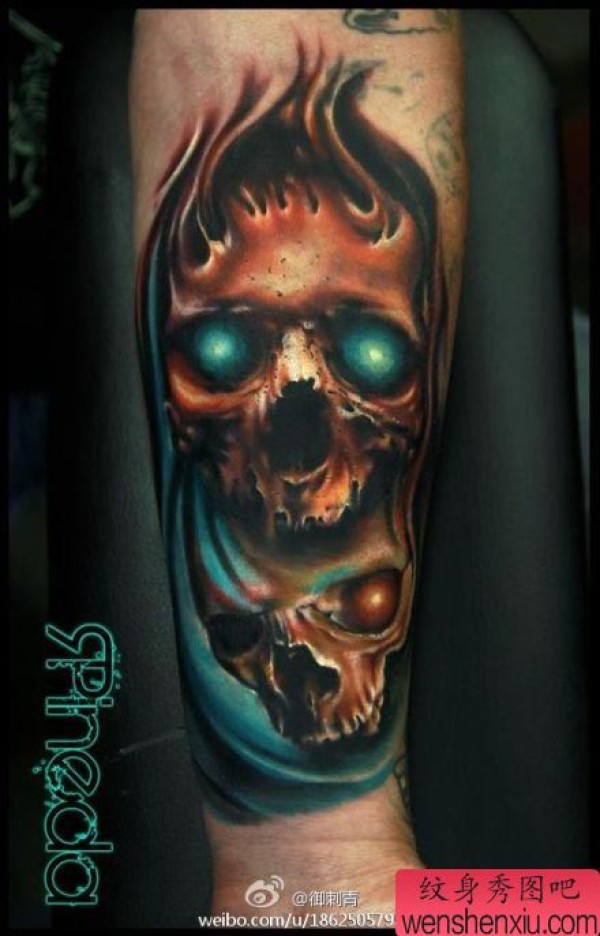 手臂很酷经典的欧美彩色骷髅纹身图案