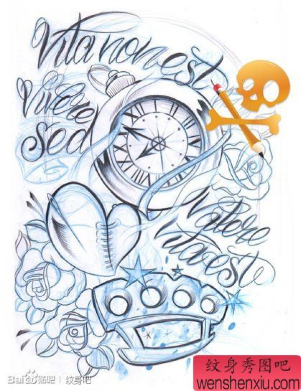 一张时尚时尚的怀表爱心拳刺纹身手稿