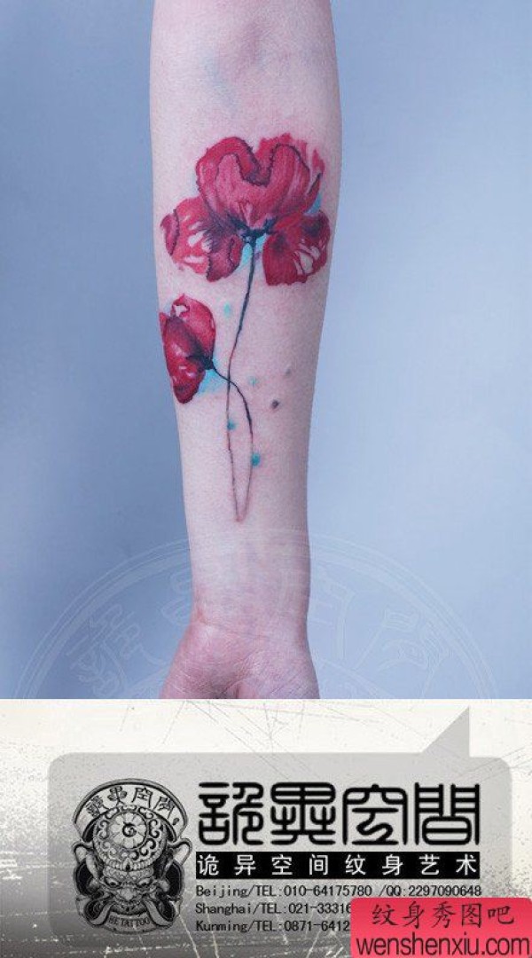 手臂漂亮时尚的彩色罂粟花纹身图案