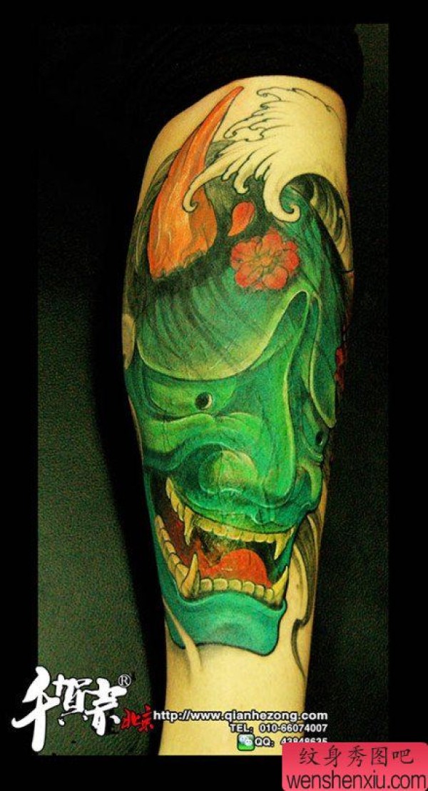 腿部经典时尚的一张绿色般若纹身图案