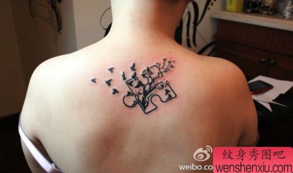 男士后背一张图腾小树与小鸟纹身图案