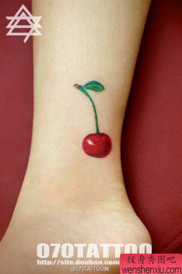女生脚踝处一张小巧精美的樱桃纹身图案