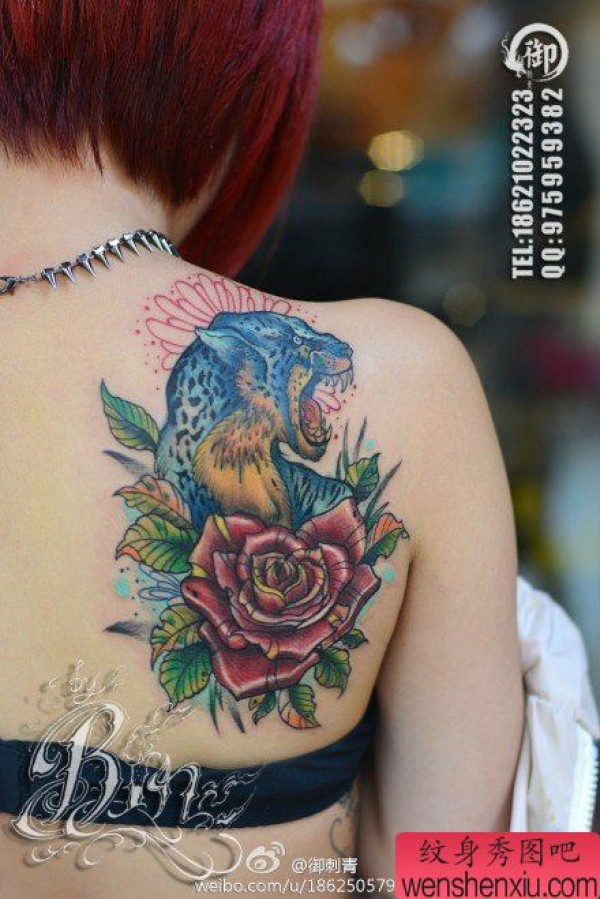 女生肩背时尚经典的豹子玫瑰花纹身图案