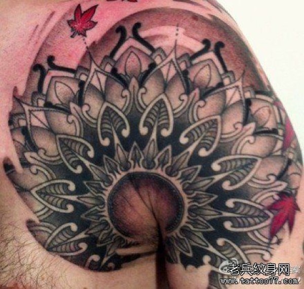 男士肩膀处时尚经典的图腾花卉纹身图案