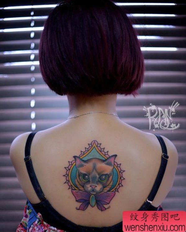 女生后背时尚呆呆的猫咪纹身图案