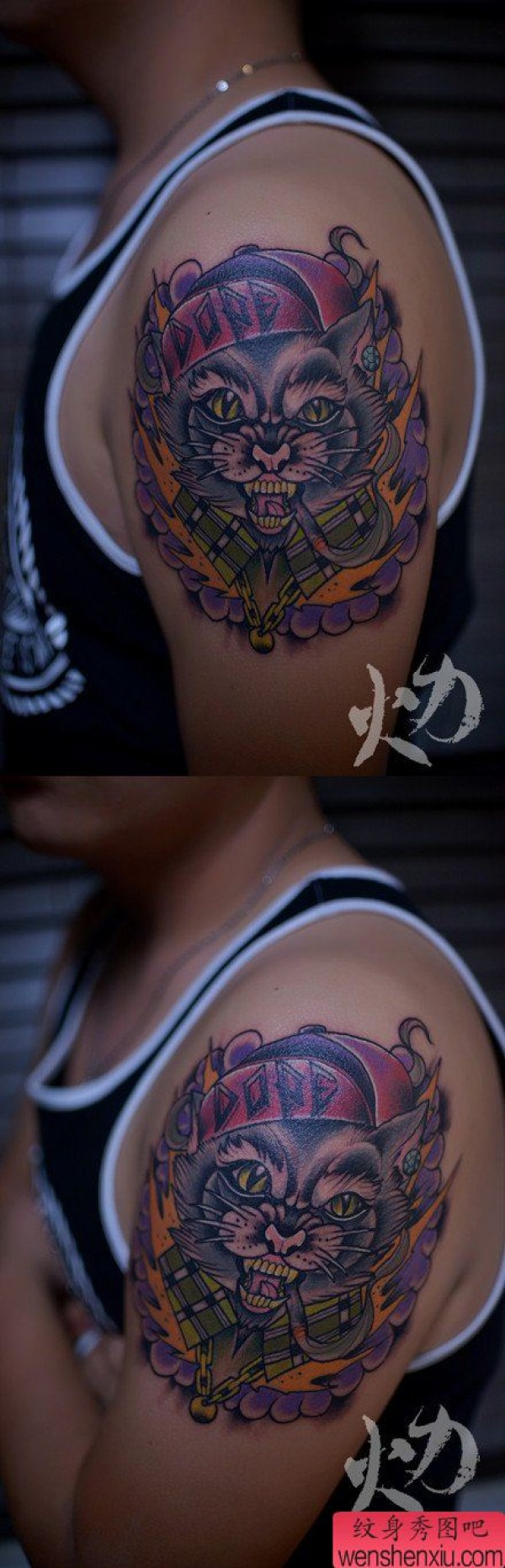手臂一张抽烟的猫咪纹身图案