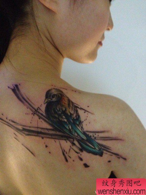 女生肩背时尚精美的麻雀纹身图案