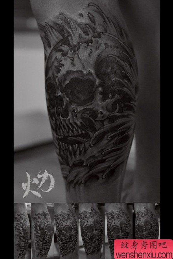 男生腿部经典很酷的骷髅纹身图案