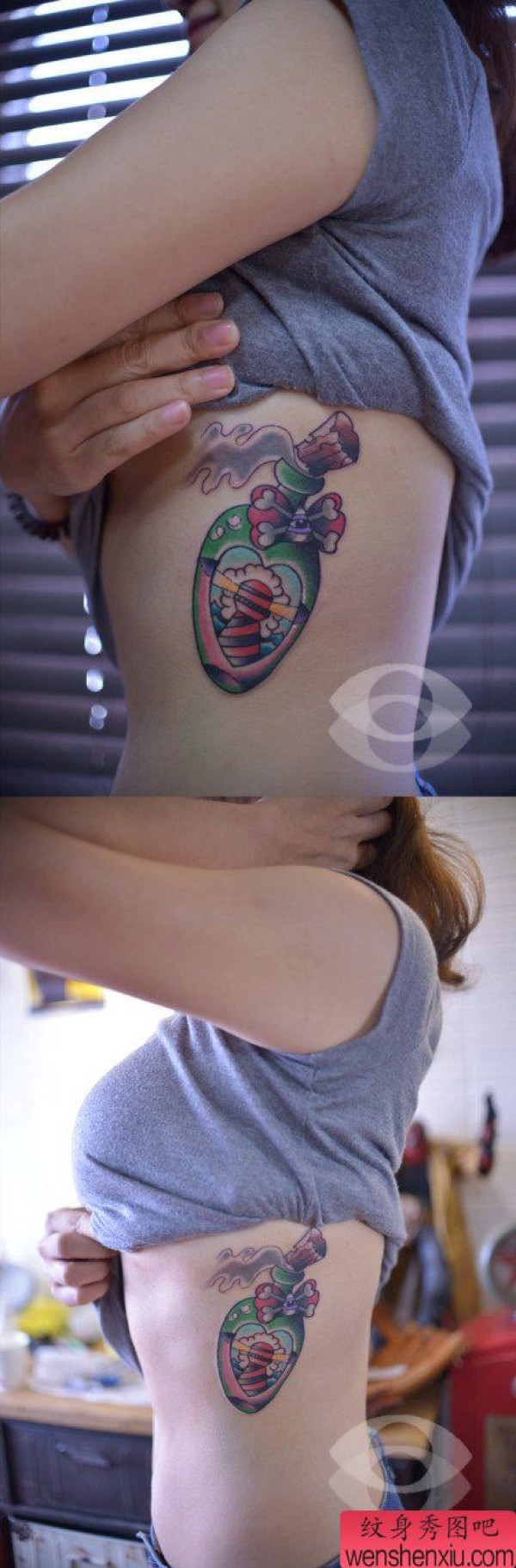 美女侧胸时尚经典的瓶子与灯塔纹身图案