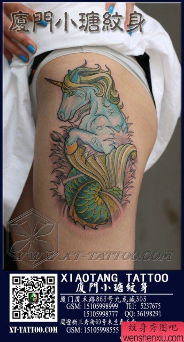 女生腿部一张精美时尚的马头鱼尾兽纹身图案