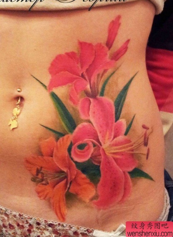 美女腹部唯美漂亮的彩色百合花纹身图案
