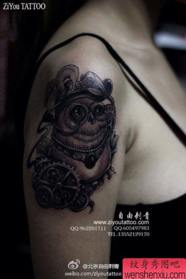 女生手臂一张经典的黑白猫头鹰纹身图案