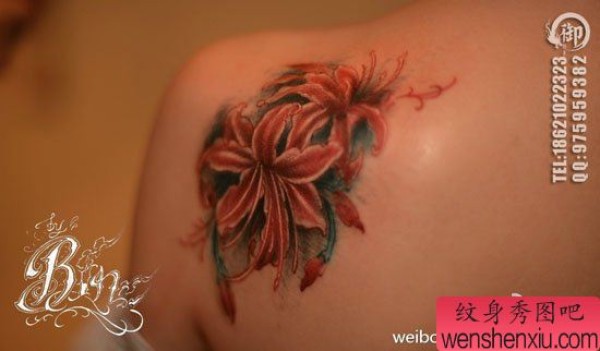女生肩背漂亮时尚的彼岸花纹身图案