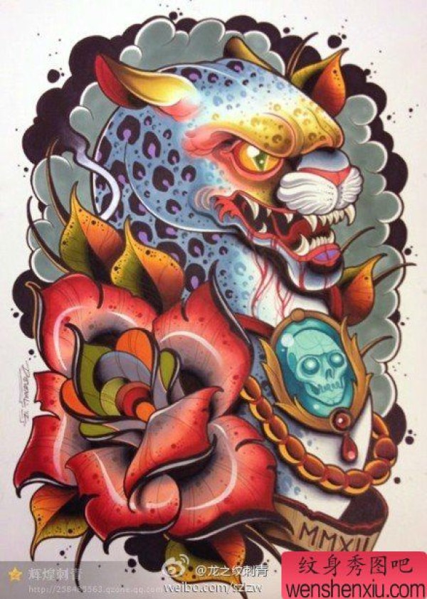 一张帅气很酷的豹子与玫瑰花纹身手稿