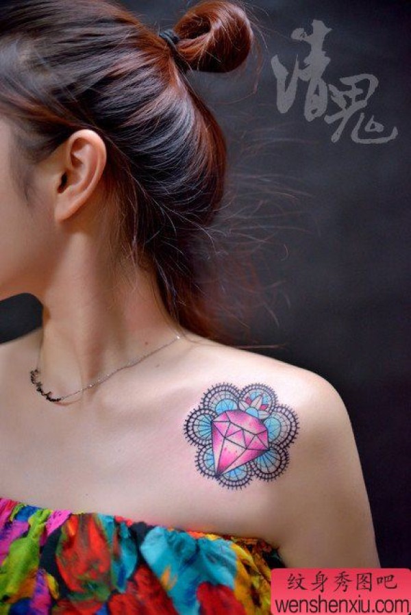 女生肩膀处小巧漂亮的彩色钻石纹身图案