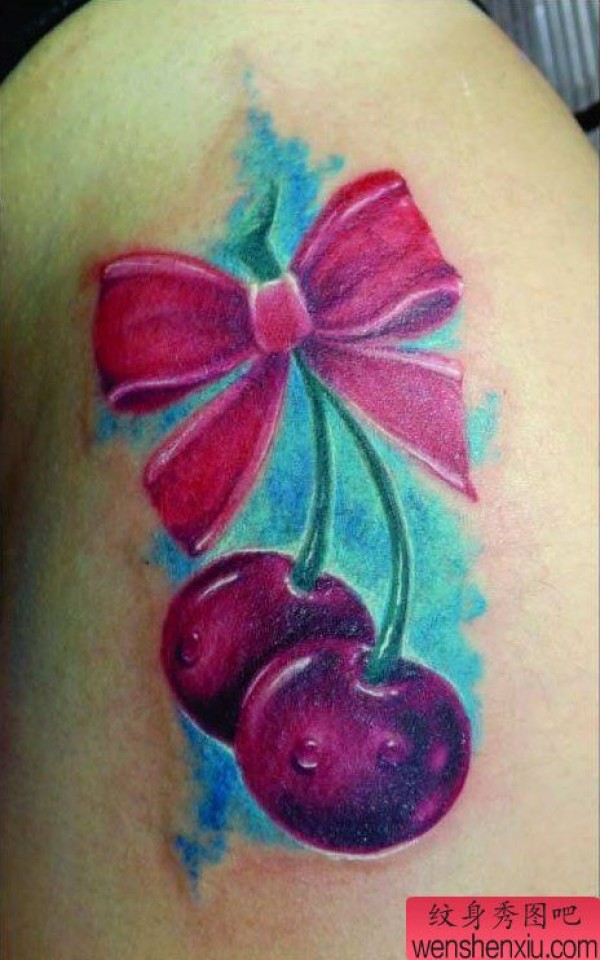 女生胯部小巧时尚的蝴蝶结樱桃纹身图案