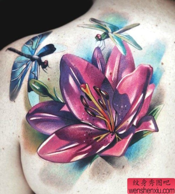 女生肩背精美漂亮的彩色花卉与蜻蜓纹身图案