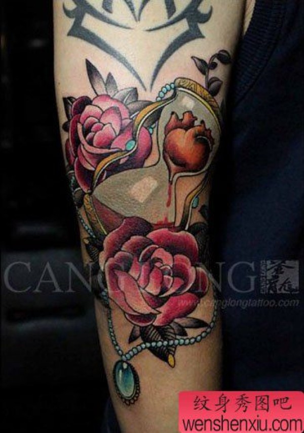 手臂时尚精美的沙漏玫瑰花纹身图案