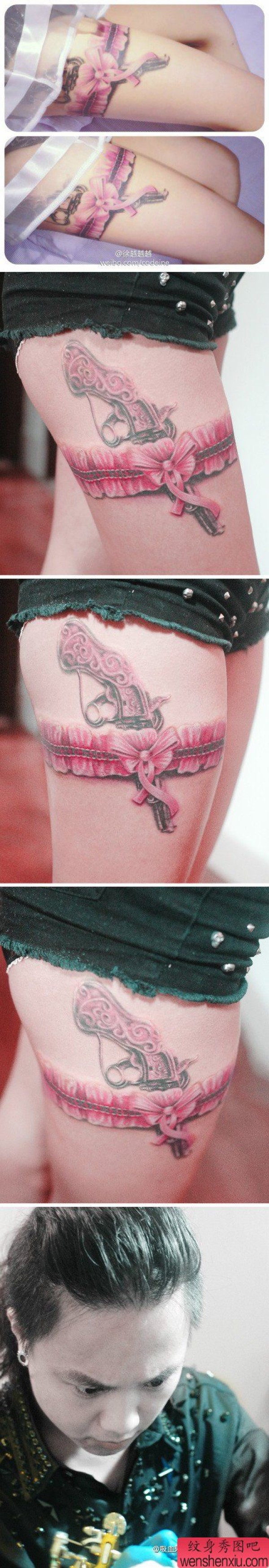 美女腿部时尚精美的一张粉色蕾丝与手枪纹身图案