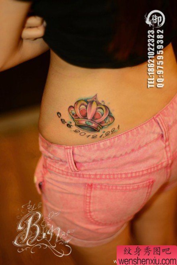 美女腰部经典好看的彩色皇冠纹身图案