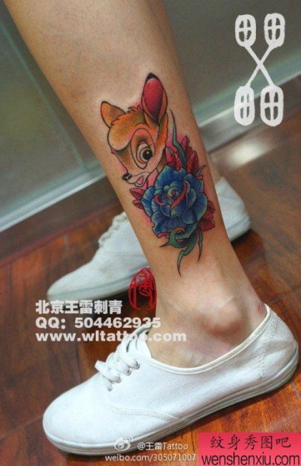 女生腿部经典可爱的小鹿玫瑰纹身图案