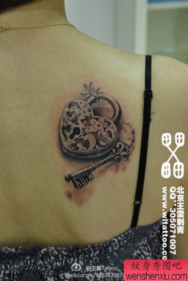 女生肩背时尚时尚的黑白爱心锁与钥匙纹身图案