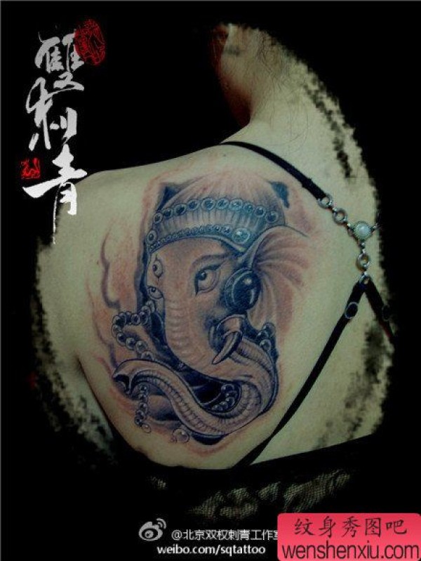 女生后背经典的黑白象神纹身图案