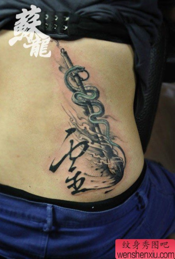 美女腰部时尚经典的毛笔与蛇纹身图案
