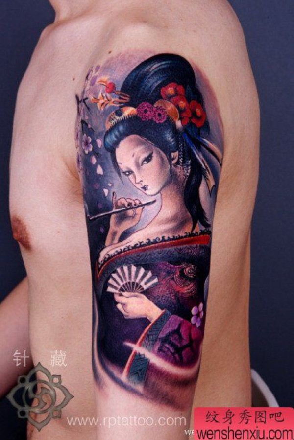 男士手臂一张时尚漂亮的艺妓纹身图案