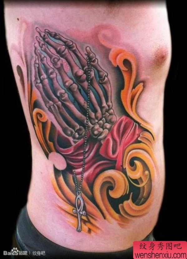 男士腰部经典很帅的骷髅手纹身图案