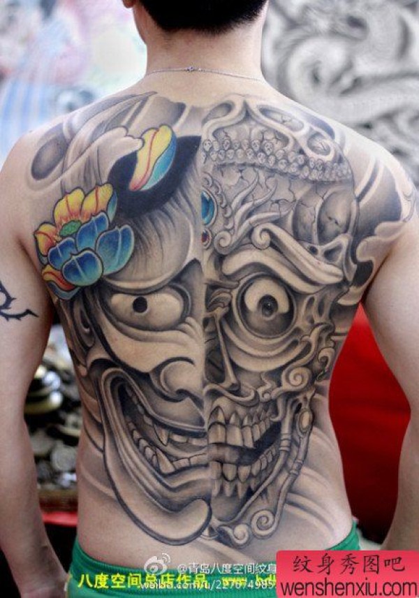 男生后背很酷的满背一半般若一半嘎巴拉纹身图案