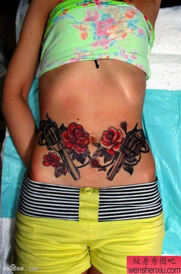 女生腹部时尚时尚的手枪玫瑰纹身图案