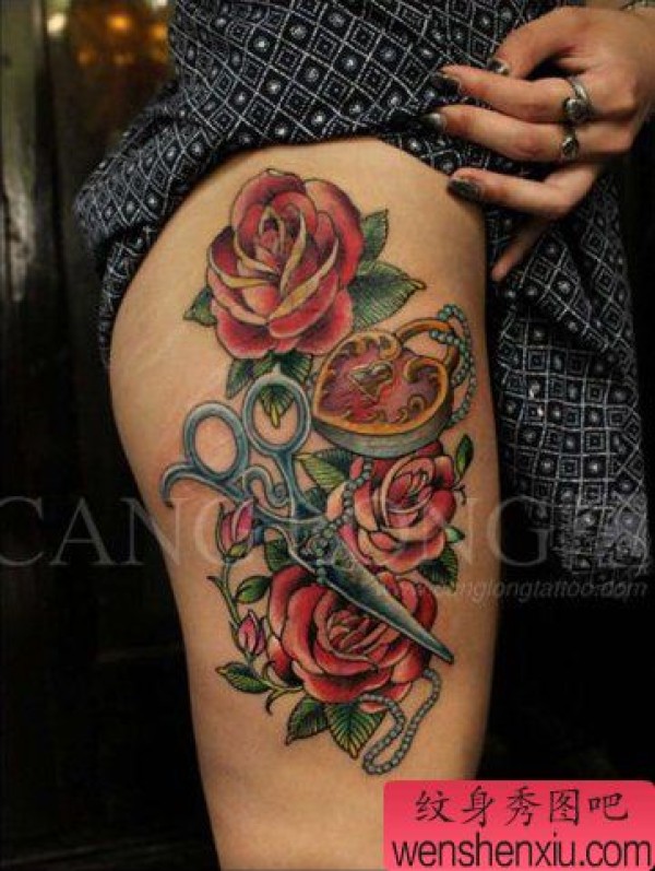 女生腿部很酷时尚的玫瑰剪刀锁纹身图案