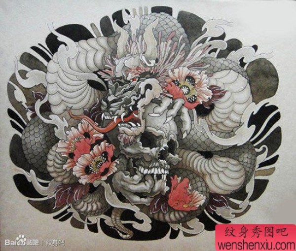 龙纹身手稿_一组老传统黑灰龙手稿纹身图案