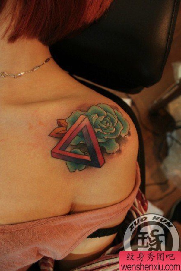 美女肩膀处时尚唯美的三角与玫瑰花纹身图案