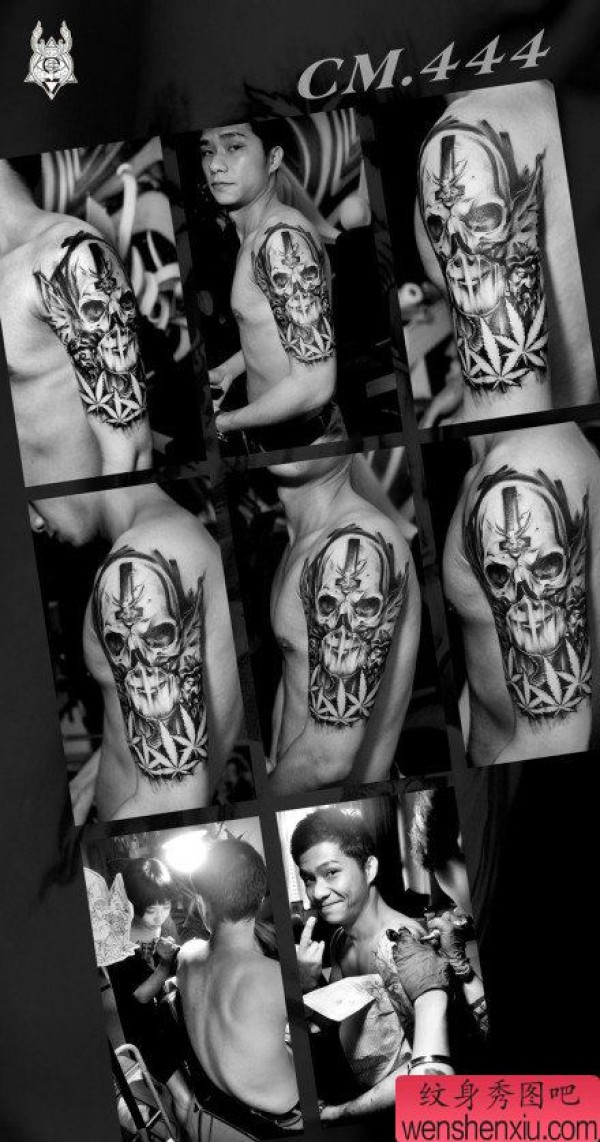 男生手臂时尚很酷的黑白骷髅纹身图案