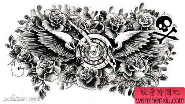 一张精美时尚的怀表翅膀玫瑰纹身图案