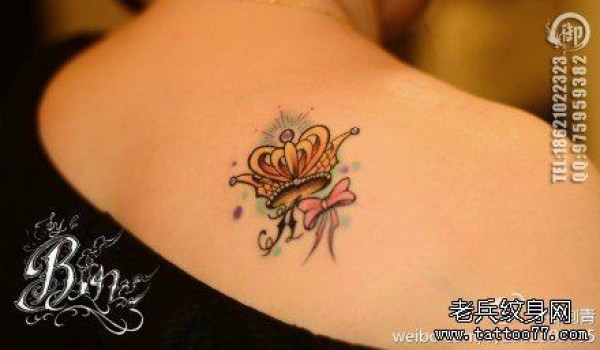 女生肩背时尚小巧的皇冠与蝴蝶结纹身图案