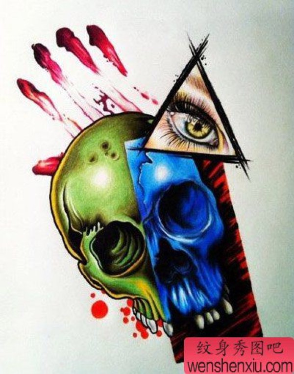 一张很酷经典的彩色骷髅与眼睛纹身图案
