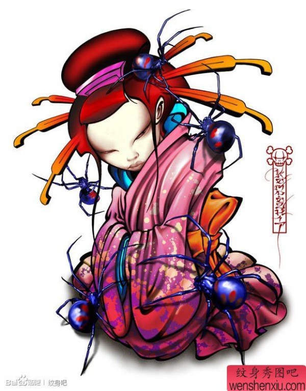 一张很酷经典的艺妓与蜘蛛纹身图案