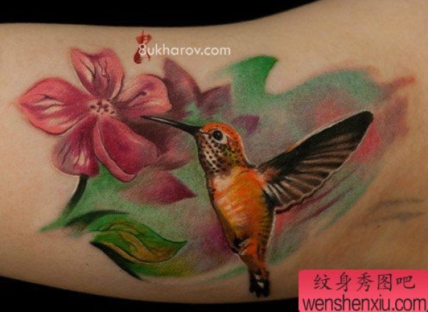 手臂内侧一张时尚好看的蜂鸟纹身图案