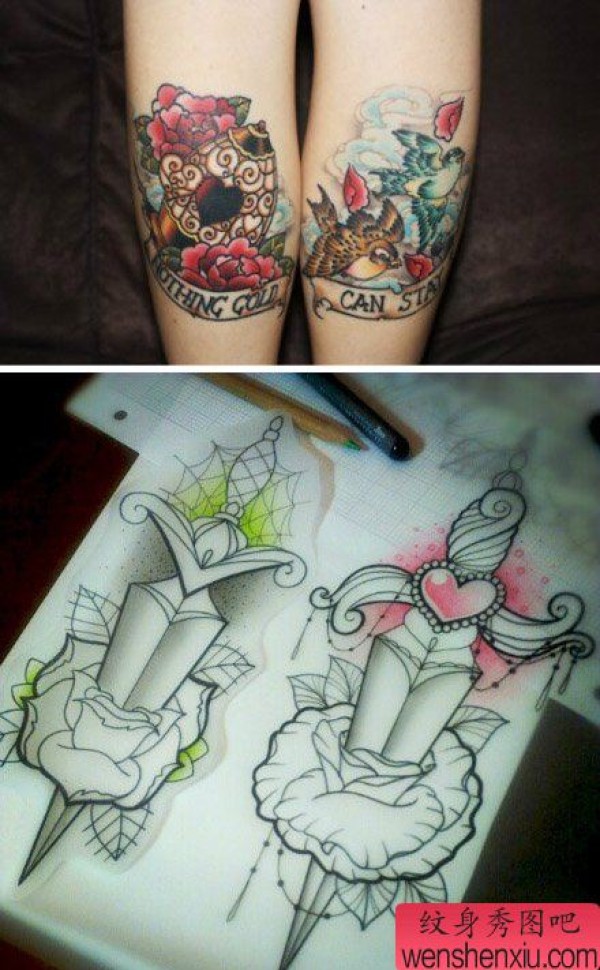 一套经典的情侣小鸟与鸟笼匕首纹身图案