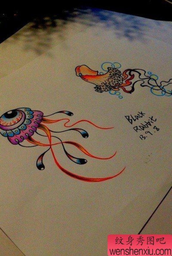 一张小巧时尚的彩色水母纹身手稿