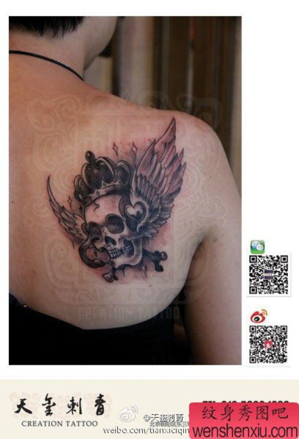 女生后肩背时尚很酷的骷髅皇冠纹身图案