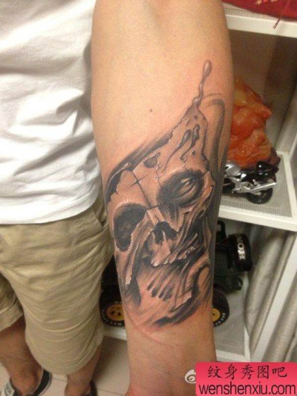 男生手臂时尚经典的黑白骷髅纹身图案