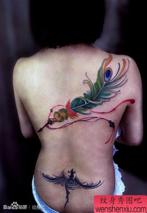 女生后背唯美漂亮的彩色羽毛纹身图案