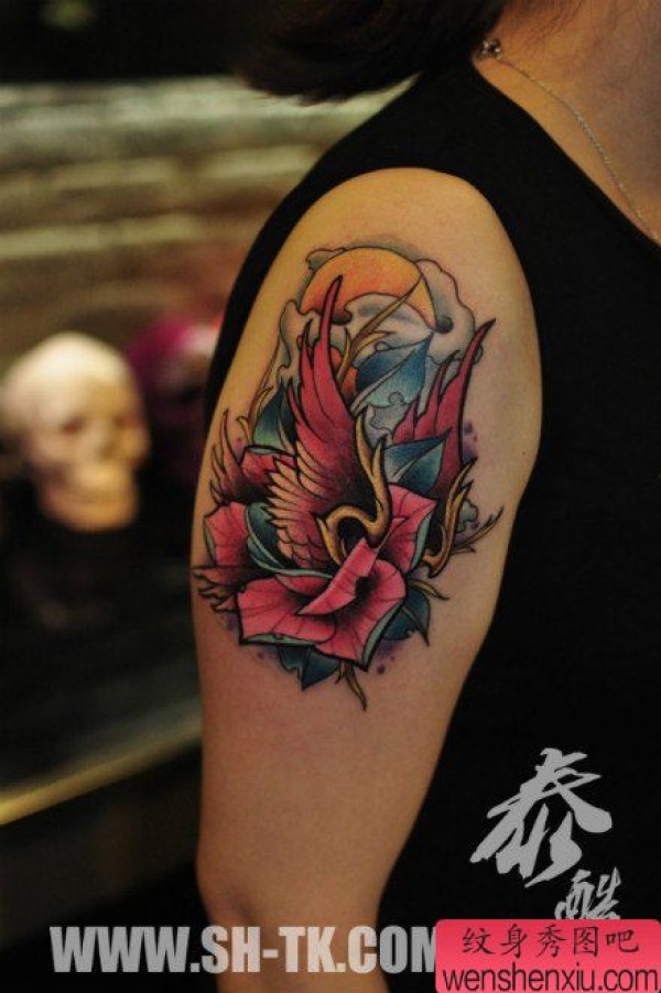 手臂时尚好看的玫瑰与翅膀纹身图案