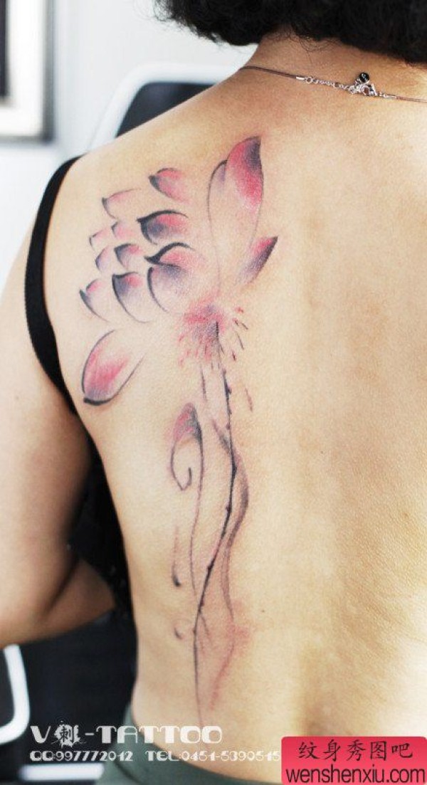 美女后背唯美时尚的写意莲花纹身图案